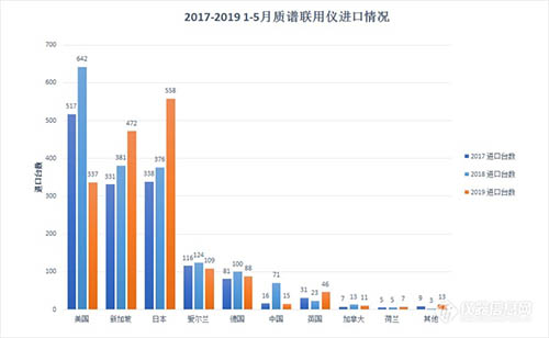 我們進一步對比了2017年-2019年1-5月進口質譜聯(lián)用儀的原產(chǎn)地情況。從圖中可以明顯看出,2019年1-5月年我國從美國進口的質譜聯(lián)用儀數(shù)目銳減,減少了近一半的數(shù)目,進口額也減少了超過三分之一,而相對從新加坡和日本進口的質譜聯(lián)用儀數(shù)目有了一個明顯的增長,表面我國質譜聯(lián)用儀的進口市場貿(mào)易戰(zhàn)的影響十分明顯。