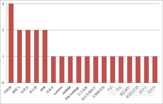 從領域上看,并購交易主要集中在生命科學領域,總計達到11筆;分析儀器次之,交易數量累計7筆。上半年,丹納赫集團(含貝克曼庫爾特)的收購數量暫時領先。進口品牌仍是資本市場的主導者,但萊伯泰科、海爾生物醫療等國產企業也有不俗表現。