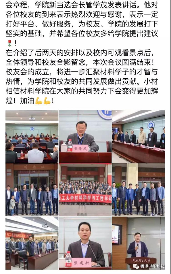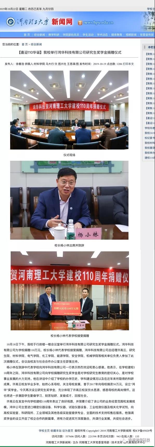 金秋十月,在偉大祖國慶祝建國70周年華誕之際,河南理工大學迎來了建校110周年慶典,一大批優秀的校友們紛紛回校表示對母校的祝賀和感恩。鴻華科技有限公司總經理許高云先生回到母校參加了一些列校慶活動,并向母校捐獻110萬元設立研究生獎學金;同時鴻華科技有限公司在河南理工大學材料科學與工程學院校友會成立大會上被推選為河南理工大學材料科學與工程學院校友會理事單位。